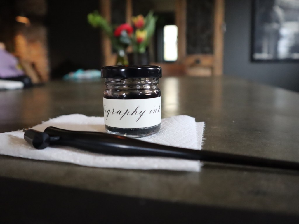 Kate opettaa ja minä olen oppilaan roolissa. Kalligrafin työskentelyä on ihana seurata: rauhalliset liikkeet ja taitava kynän hallinta on niin hienoa!