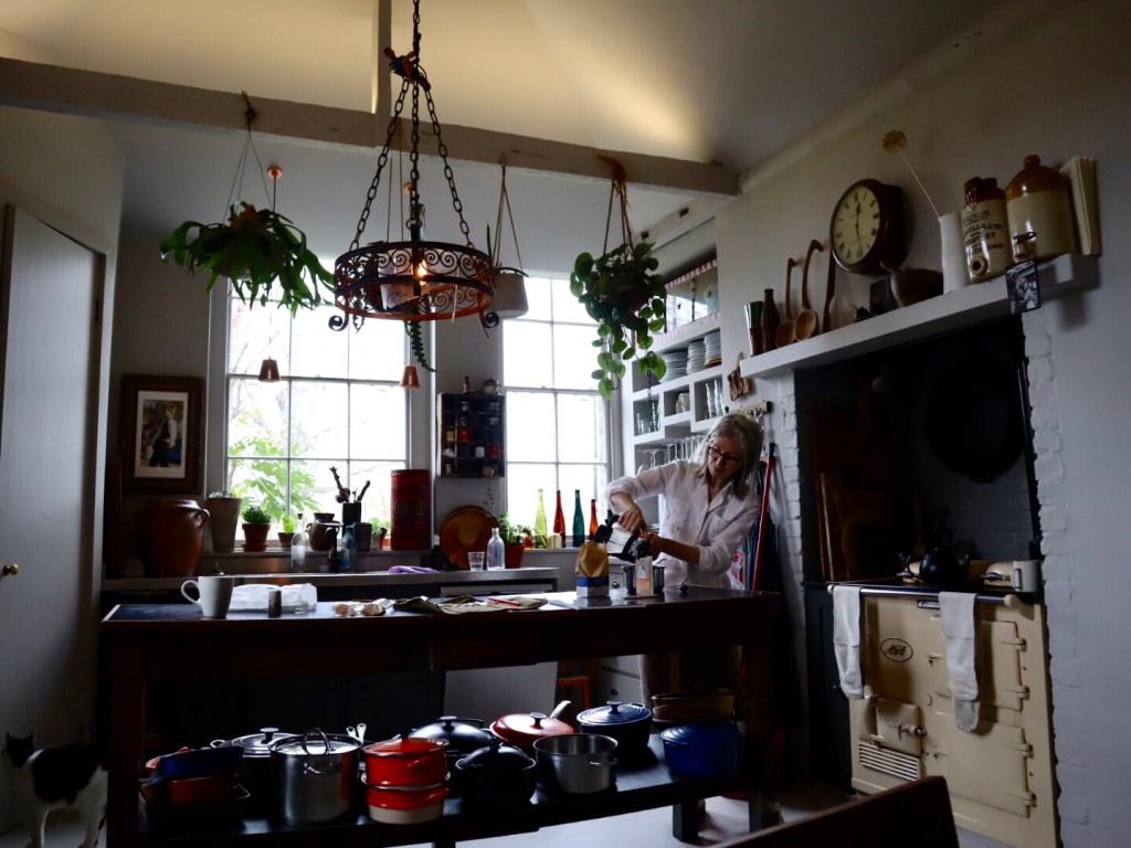 Keittiön suuren pöydän äärellä Kate järjestää kalligrafiakursseja. Talossa on asunut vuosisatojen aikana useita tunnettuja henkilöitä.