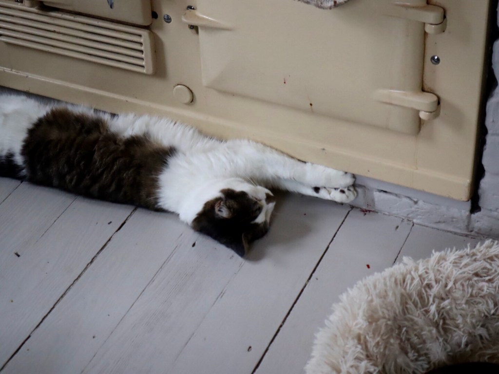 Katen kissa lämmittelee tassujaan hellaa vasten.