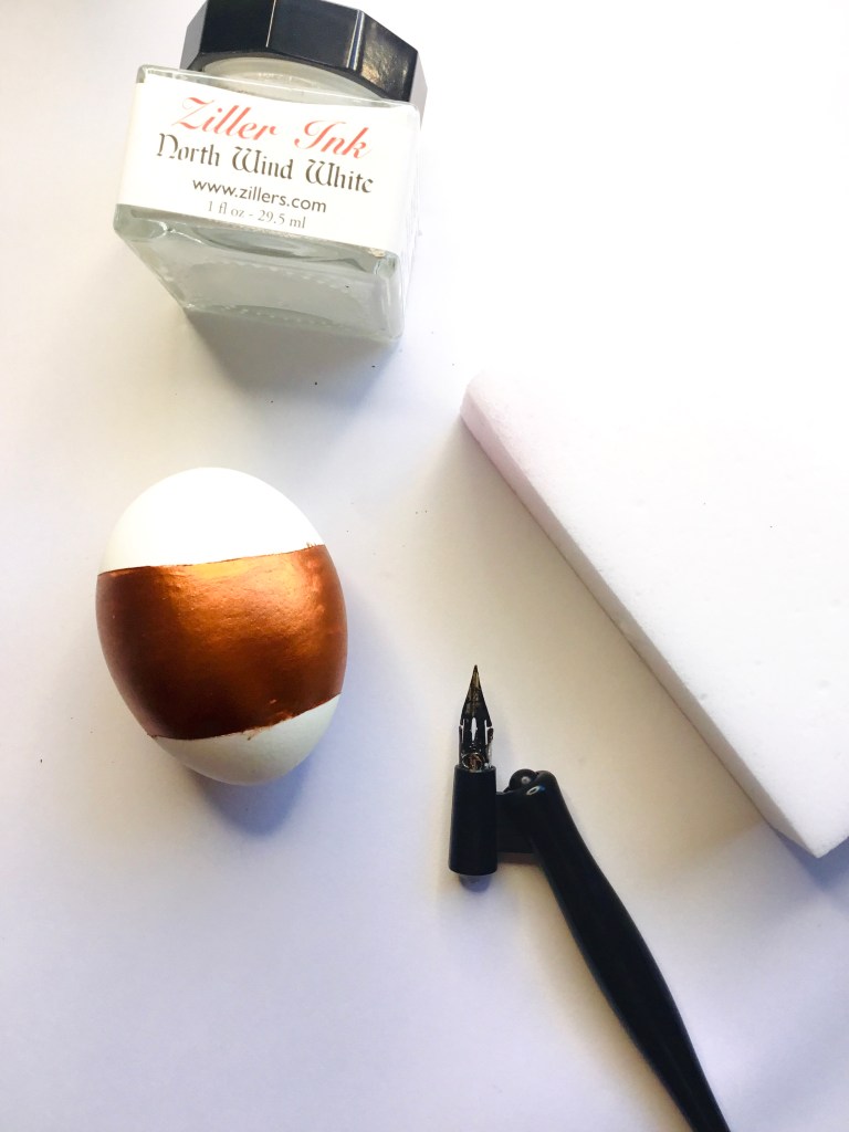 Viimeistelin koristelun kalligrafialla, jonka tein valkoisella musteella. Tekstin kirjoittaminen pyöreälle pyöreälle pinnalle on hieman haastavaa, kanamuna on vielä suhteellisen pieni pinta-alaltaan. Se ei silti tarkoita, etteikö sitä voisi kokeilla! Kannustan sinua rohkeasti tarttumaan omaan kalligrafiakynääsi: siksi listasin sinulle työvaiheet.