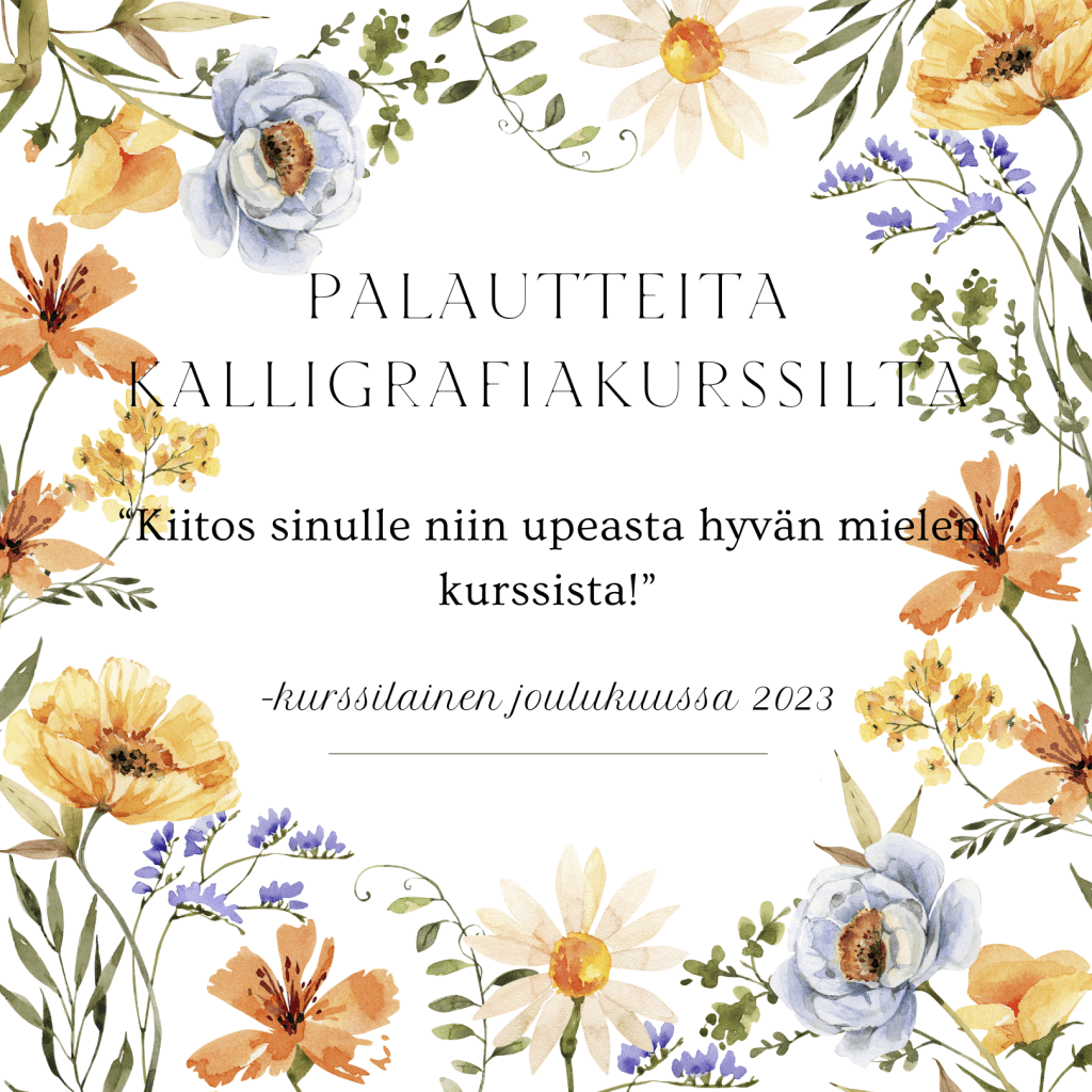 Aloitin kalligrafiakurssien järjestämisen viime syksynä, lokakuussa. Sen jälkeen olen järjestänyt kursseja kuukausittain. Tämän puolen vuoden aikana olen saanut opettaa kalligrafian alkeita Oulussa yli 70:lle ihmisille. Vaikka kalligrafian harjoittelu sisältää teknistä harjoittelua, on kursseilla ollut ihanan rentoutunut ja kannustava ilmapiiri. Kurssini ovat pienryhmiä: opetus tapahtuu kahdeksan hengen pienryhmissä, jonka ansiosta tunnelma säilyy rauhallisena koko kurssin ajan ja minulla on aikaa jokaiselle henkilökohtaiseen ohjaukseen.