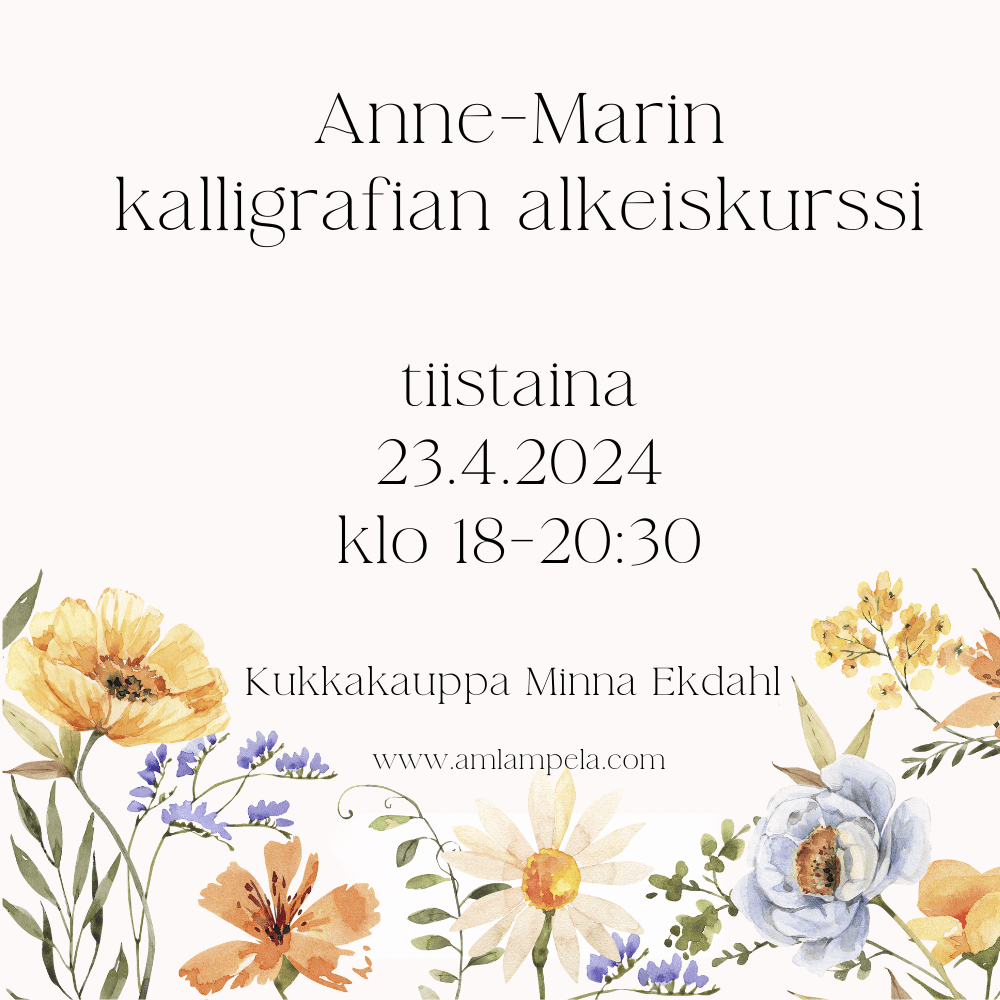 Vaikka en järjestä kursseja kesä-heinäkuussa, otan silti vastaan tilauksia yksityiskursseista. Jos sinulla tai läheiselläsi on tulossa juhlia, johon haluaisit sisällyttää kalligrafian harjoittelua, ota rohkeasti yhteyttä. Järjestän erittäin mielellä myös yksityiskursseja. Jos kaipaat sekä opetuksen ja tilan: sekin onnistuu! Kukkakauppa Minna Ekdahlin hurmaava kauppa toimii loistavasti kurssitilana myös suuremmalle ryhmälle ja kaupan sijainti Oulussa (Koskitie 25 b 1.) on loistava: Tuiran kaupunginosaan on helppo tulla autolla, julkisella, pyöräillen tai kävellen. Minnan kukkakauppa on täynnä kauniita kukkia ja sisustus on kodikas, harmoninen ja rauhallinen.